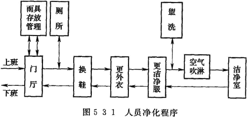 5.3.1 人員凈化用室和設施應根據潔凈室的規模、空氣潔凈度等級設置,并應設置生活用室。人員凈化用室宜按圖5.3.1的人員凈化程序進行布置。